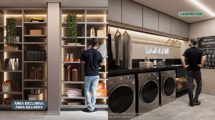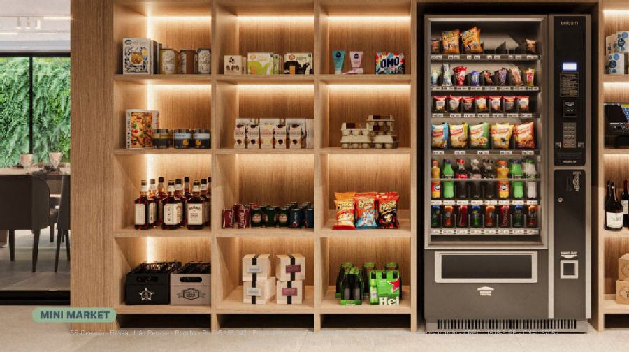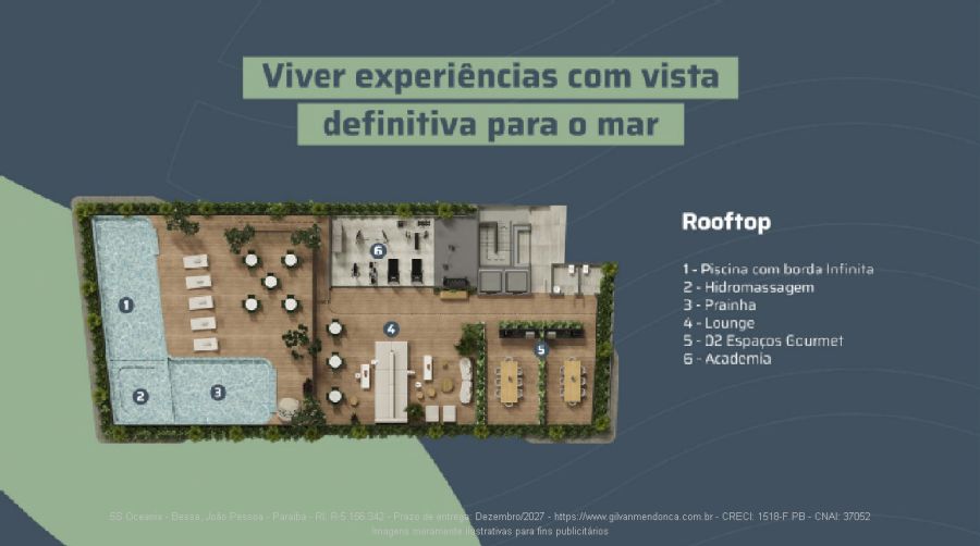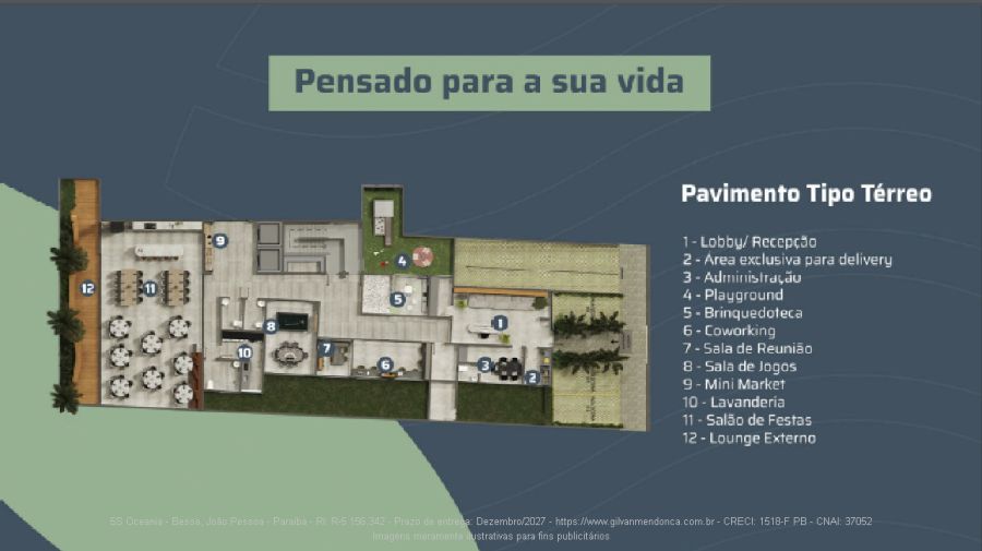 Área de lazer e convivência: Recepção e Lobby, Delivery, Administração, Playground, Brinquedoteca, Coworking, Sala de Reunião, Sala de Jogos, Mini Market, Lavanderia, Salão de Festas, Lounge Externo, Piscina com borda infinita, Hidromassagem, Piscina Infantil, Lounge Rooftop, 02 Espaços Gourmets e Academia.