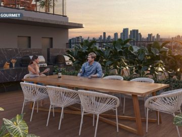 Apartamentos de 23,91 m² a 68,89 m², com 1 ou 2 quartos 154 unidades e 10 lojas comerciais 15 itens de lazer: piscina com borda infinita, hidromassagem, academia, coworking, mini market, salão de festas e muito mais!