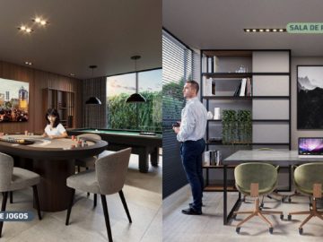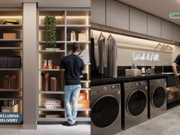 Área de lazer e convivência: Recepção e Lobby, Delivery, Administração, Playground, Brinquedoteca, Coworking, Sala de Reunião, Sala de Jogos, Mini Market, Lavanderia, Salão de Festas, Lounge Externo, Piscina com borda infinita, Hidromassagem, Piscina Infantil, Lounge Rooftop, 02 Espaços Gourmets e Academia.