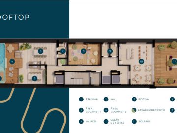 Lazer e comodidades para toda a família: Rooftop, Prainha, Área gourmet ,Spa, Piscina, Salão de festas, Brinquedoteca, WC PCD • Deck • Lavabos • Solário