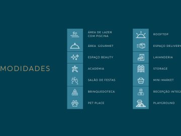 Piscina • Academia • Salão de festas • Brinquedoteca • Pet place • Rooftop • Espaço delivery • Lavanderia • Mini market • Playground • Espaço beauty • Storage • Recepção integrada