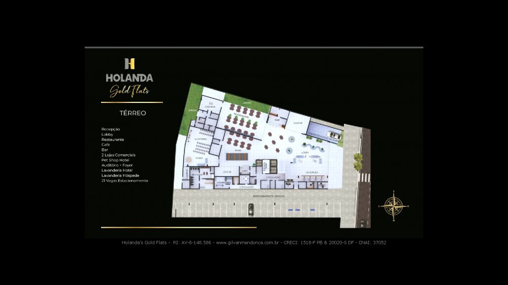 PAVIMENTO TÉRREO: Recepção, Lobby, Restaurante, Café, Bar, 2 Lojas, Comerciais, Pet Shop Hotel, Auditório + Foyer, Laanderia Hotel, Lavanderia Hóspede, 22 Vagas Estacionamento.