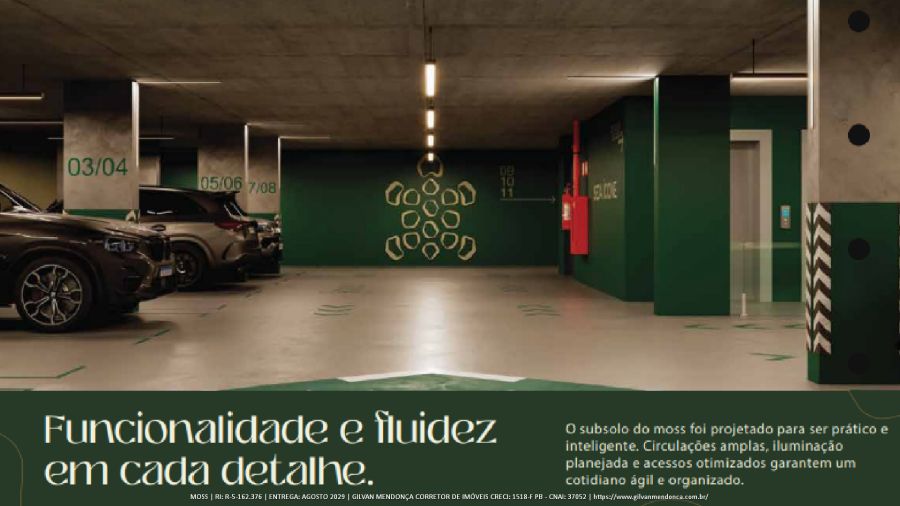 O subsolo do moss foi projetado para ser prático e inteligente. Circulações amplas, iluminação planejada e acessos otimizados garantem um cotidiano ágil e organizado.