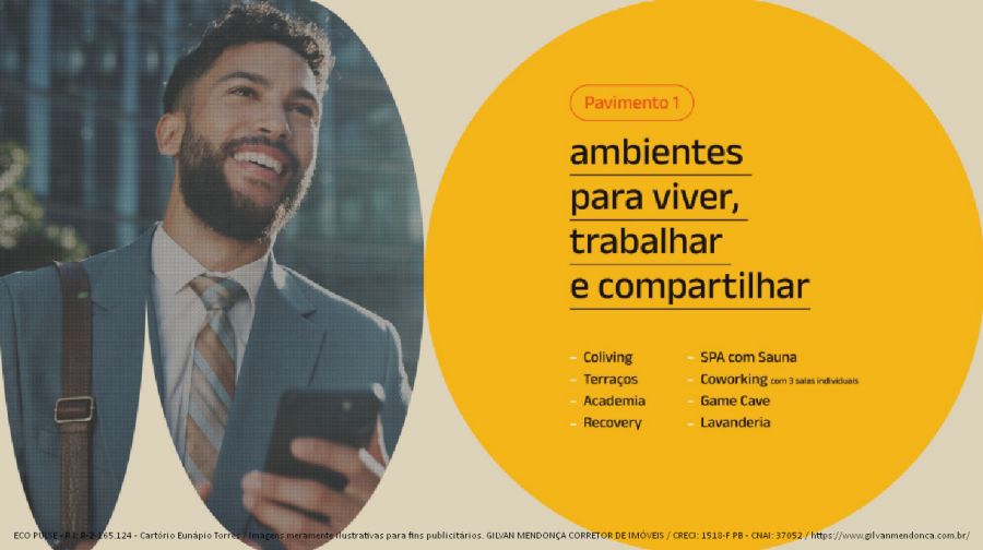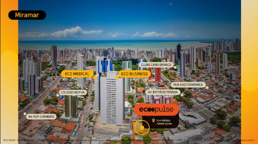 ECO PULSE: Studios compactos, inteligentes e funcionais, assinado por talentos que inspiram uma nova vida, no coração de Miramar, entre as avenidas Ruy Carneiro e Epitácio Pessoa, nasce um marco urbano que conecta tradição e futuro.