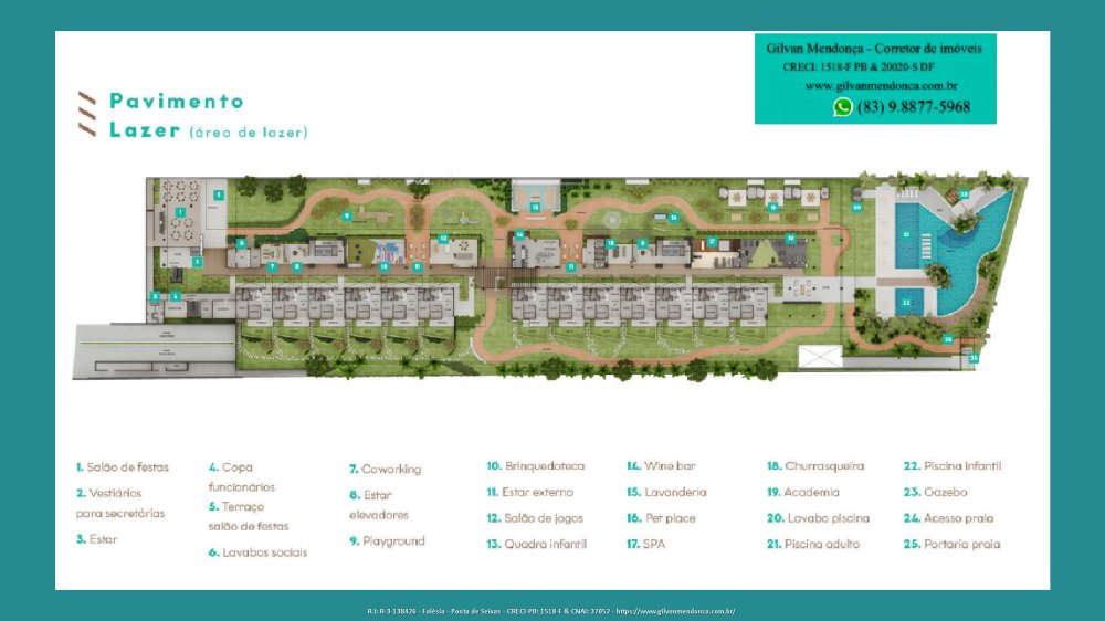 1. Salão de festas 2. Vestiários para secretárias 3. Estar 4. Copa funcionários 5. Terraço salão de festas 6. Lavabos sociais 7. Coworking 8. Estar elevadores 9. Playground 10. Brinquedoteca 11. Estar externo 12. Salão de jogos 13. Quadra infantil 14. Wine bar 15. Lavanderia 16. Pet place 17. SPA 18. Churrasqueira 19. Academia 20. Lavabo piscina 21. Piscina adulto 22. Piscina infantil 23. Gazebo 24. Acesso praia 25. Portaria praia 26. Estacionamento 27. Porte-cochère 28. Eclusa 29. Lobby 30. Administração 31. Monitoramento 32. Rampa de veículos 33. Lixo e gás 34. Hub para delivery