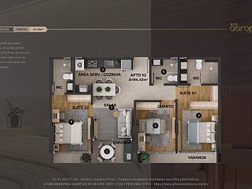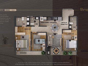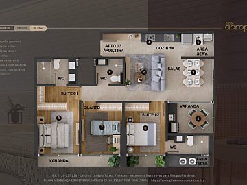 Varanda gourmet; Sala de estar/jantar; Cozinha/Área de serviço; 2 suítes com varanda; Quarto com varanda; Wc social.