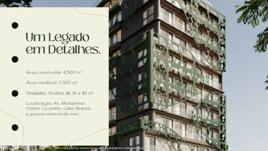 ITENS DE SUSTENTABILIDADE: • Automação • Área de lazer completa e cheia de charme • Unidades de 26 a 40m² • Um produto inovador, inteligente e com alto potencial de valorização. • Um Legado em Detalhes • Área construída: 4.500 m² • Área vendável: 2.500 m² • Unidades: Studios de 16 a 42 m²