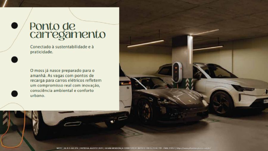 O moss já nasce preparado para o amanhã. As vagas com pontos de recarga para carros elétricos refletem um compromisso real com inovação, consciência ambiental e conforto urbano.