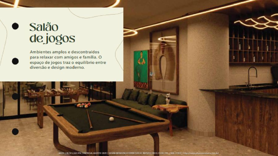 Ambientes amplos e descontraídos para relaxar com amigos e família. O espaço de jogos traz o equilíbrio entre diversão e design moderno.